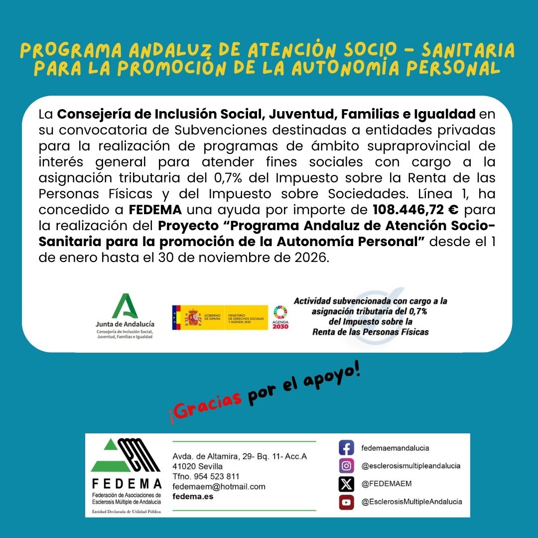 La Consejería de Inclusión Social, Juventud, Familias e Igualdad en su convocatoria de Subvenciones destinadas a entidades privadas para la realización de programas de ámbito supraprovincial de interés general para atender fines sociales con cargo a la asignación tributaria del 0,7% del Impuesto sobre la Renta de las Personas Físicas y del Impuesto sobre Sociedades. Línea 1, ha concedido a FEDEMA una ayuda por importe de 108.446,72 € para la realización del Proyecto «Programa Andaluz de Atención Socio- Sanitaria para la promoción de la Autonomía Personal» desde el 1 de enero hasta el 30 de noviembre de 2026.